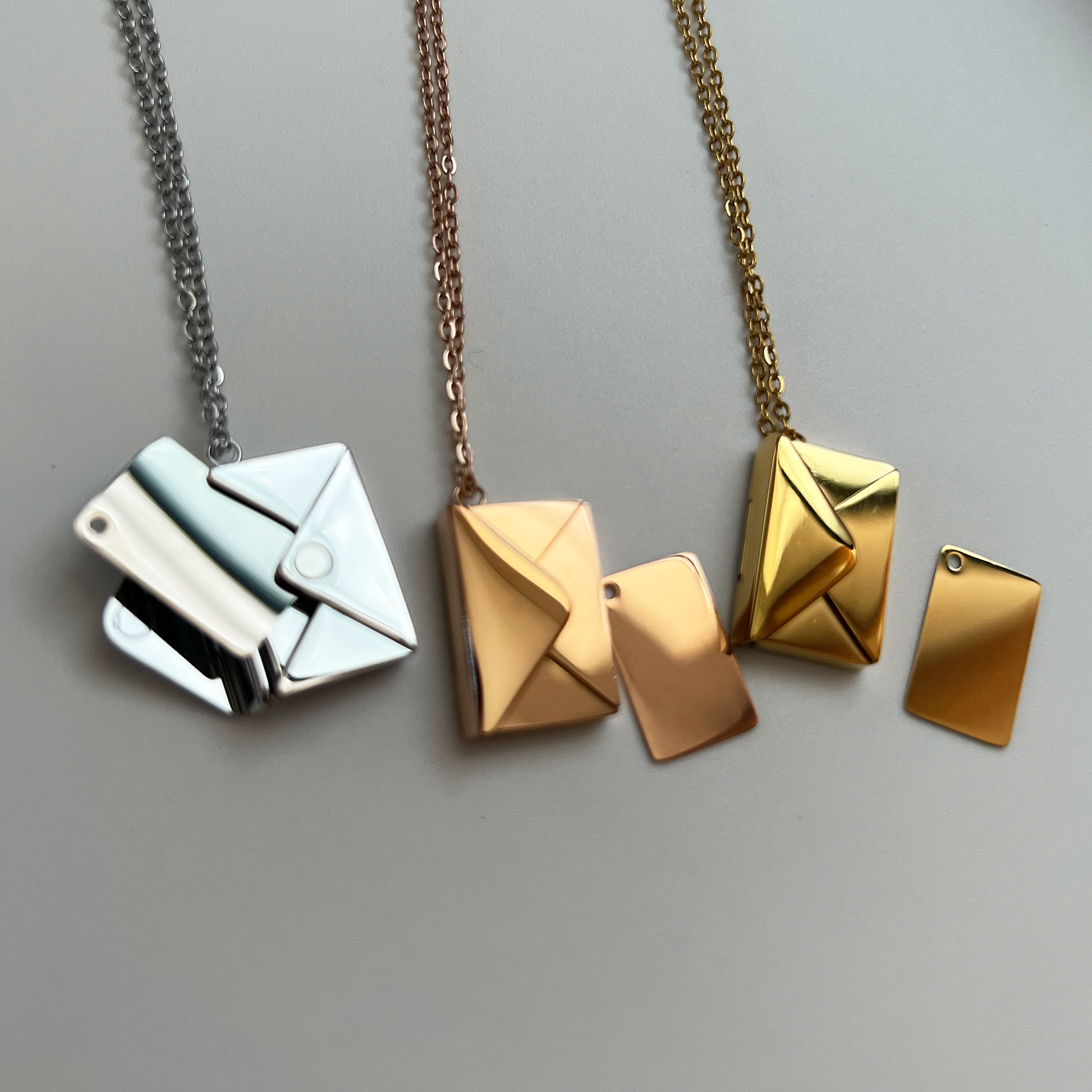 Polished stainless steel envelope necklace blank. Constructed from high-quality stainless steel, this material offers outstanding durability and resistance to rust, ensuring longevity. Its resilience against rust and fading assures extended usage over time.